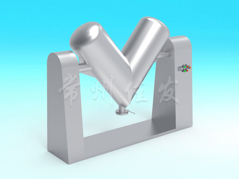 該機通過機械傳動,使不對稱的V型圓柱體內(nèi)的物料做往復(fù)翻動,達(dá)到均勻混合之目的。